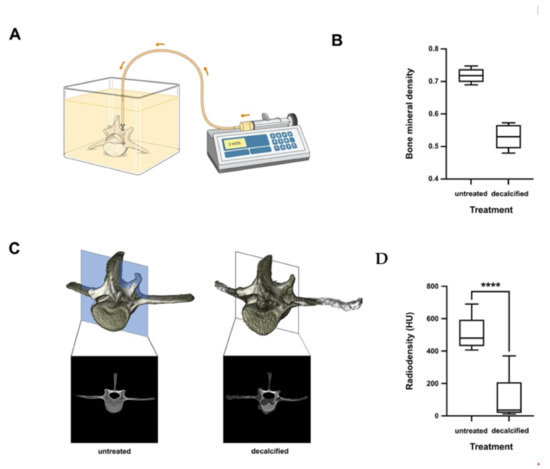 Vertebrae were dissected, and an intraosseous cannula (Teleflex, Wayne, PA, USA) was subsequently inserted in both pedicles. Vertebrae were flushed repeatedly using normal saline before decalcification. Decalcifying solution (Shandon TBD-1, Thermo Fischer Scientific, Waltham, MA, USA) in dilution 1:4 was perfused at 2 mL/h using a syringe pump (Braun, Kronberg, Germany) for 12 h via each pedicle. Vertebrae were rinsed and kept in normal saline. Measurements of the BMD were performed prior to and after decalcification.