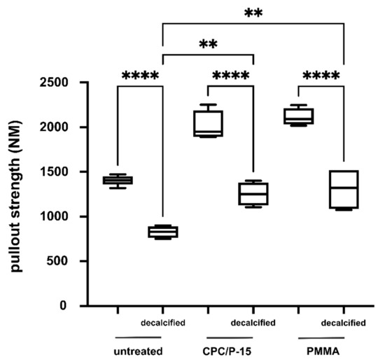 Axial pullout test and BMD in osteoporotic bone. In decalcified vertebrae, Fmax was significantly lower (1405 ± 55.97 N) compared to not decalcified vertebrae (828 ± 66 N; p < 0.0001). Fmax was significantly higher in those decalcified vertebrae augmented with CPC/P-15 (1252 ± 131 N; p < 0.0078) and those with PMMA (1308 ± 244 N; p = 0.04). There was no statistically significant difference between PMMA and CPC/P-15 (p = 0.94). ** p < 0.01, **** p < 0.0005.