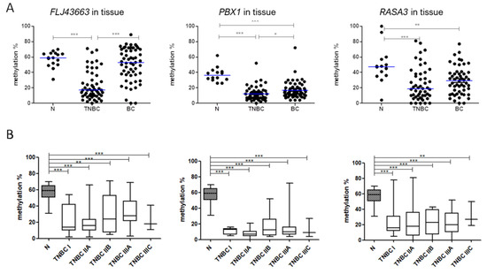 Methylation status of the FLJ43663, PBX1, and RASA3 genes in breast tissues. (A) Methylation levels of these genes were measured by pyrosequencing in FFPE samples from 16 non-neoplastic breast tissues (N), 51 TNBC, and 57 BC tissues other than TNBC subtype. The horizontal blue lines represent the median of the series. (B) Methylation percentages of the three selected genes in 16 non-neoplastic breast tissues (N), and tumours from patients with TNBC at stage I (n = 8), stage IIA (n = 21), stage IIB (n = 6), stage IIIA (n = 8), and stage IIIC (n = 3) (*, p < 0.05; **, p < 0.01; ***, p < 0.001).