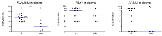 Methylation percentage of the FLJ43663, PBX1, and RASA3 genes in total circulating cell-free DNA. Methylation levels of these genes were measured by pyrosequencing in plasma samples from 15 healthy women (N) and 6 TNBC patients. The horizontal blue lines represent the median of the series (***, p < 0.0001).
