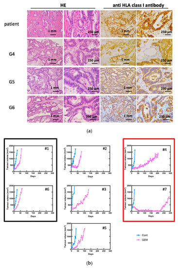 Gemcitabine (GEM)-treated pancreatic cancer patient-derived xenograft (PDX) mice. (a) Establishment of PDX mice. Morphological characteristics were well preserved in xenograft tumors in NSG mice even at G6. Hematoxylin and eosin (H&E) staining and immunohistochemistry for anti-HLA class I antibody are shown. (b) Tumor growth curve after treatment of GEM. Seven PDX lines were treated with GEM after tumor volume exceeded 200 mm3. Different PDXs had different sensitivities for GEM. PDX mice that had high sensitivity for GEM are in the red box, and those with low sensitivity are in the black box. #1–#7 is shown as the name of the xenograft.