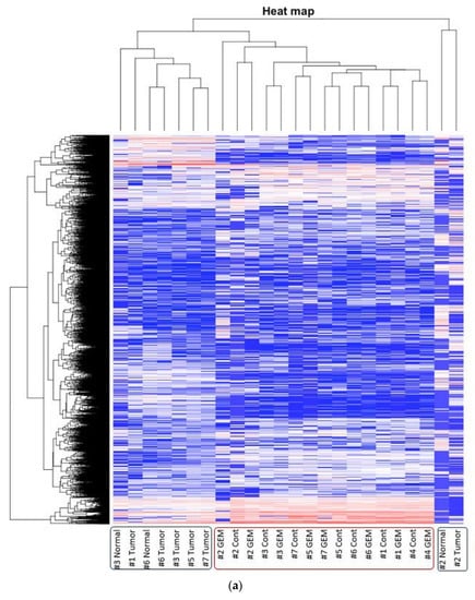 RNA Seq data from PDXs were processed with Xenome (version 1.0.1) (https://github.com/data61/gossamer/blob/master/docs/xenome.md; accessed on 10 May 2021) [13] to classify the raw sequenced reads into human (hg19) or mouse (mm9) reads. Transcript expression was quantified using Salmon (version 0.6.0) (https://github.com/COMBINE-lab/salmon; accessed on 22 July 2021) [14]. Furthermore, we generated a heatmap and cluster of differentially expressed genes in RNAseq using R (version 3.2.0) (https://www.r-project.org; accessed on 22 July 2021).