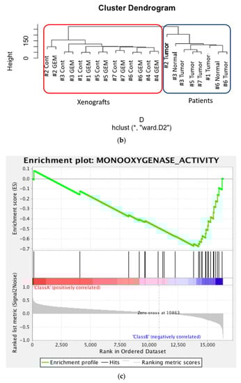 RNA-seq was performed using gemcitabine (GEM)-treated tumors. (a) Heat map of RNA expression. Expression values are represented as colors, where the range of colors (red, pink, light blue, and dark blue) shows the range of expression values (high, moderate, low, and lowest), respectively. Patient-derived xenograft (PDX) samples are in the red box, and samples obtained directly from patients are in the blue box. Cont is control sample. (b) Cluster dendrogram of (a). The height axis displays the distance between observations and/or clusters. The horizontal bars indicate the point at which two clusters/observations merged. PDX samples are in the red box, and samples obtained directly from patients are in the blue box. (c) GSEA plot depicting the enrichment of genes upregulated in monooxygenase activity. We analyzed whether the genes whose expression differed between the control and GEM were biased to a specific gene set. (d) Heatmap and the list of the genes involved in monooxygenase activity. Among the genes involved in monooxygenase activity, genes within the red lines were upregulated in the GEM-treated group. #1–#7 is shown as the name of the xenograft.