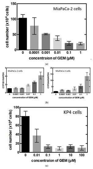 To identify the central compound responsible for GEM resistance in pancreatic cancer, we examined the proliferation of pancreatic cancer cell lines in vitro. The cell number decreased in a concentration-dependent manner following GEM treatment in the MiaPaCa-2 cells (Figure 3a). Conversely, the mRNA expression of CYP1B1 and CYP2A6 increased upon GEM treatment in a concentration-dependent manner (Figure 3b). However, no other expression changes were observed among the genes shown in Figure 2d. We also conducted similar experiments in another pancreatic cancer cell line, KP4. The cell number decreased in a concentration-dependent manner following GEM treatment in KP4 cells, as observed in the case of MiaPaCa-2 cells (Figure 3c). However, no effect was observed beyond 0.1 μM GEM. Therefore, we used only 0, 0.01, and 0.1 μM concentrations of GEM for the qPCR experiments. The mRNA expression of CYP1B1 and CYP2A6 increased upon GEM treatment with increasing concentrations of GEM (Figure 3d).
