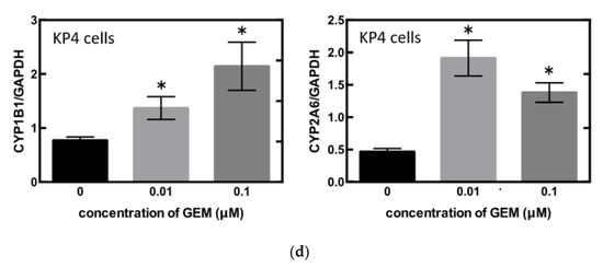 (a) MiaPaCa-2 cells were treated with gemcitabine (GEM) 0–1 µM for 48 h, and the cell number was counted. (b) MiaPaCa-2 cells were treated with GEM, and after 48 h, RNA was extracted from the cells, and qPCR was performed using CYP1B1 or CYP2A6 primers. (c) KP4 cells were treated with GEM 0–1 µM for 48 h, and the cell number was counted. (d) KP4 cells were treated GEM, and after 48 h, RNA was extracted from the cells, and qPCR was performed using CYP1B1 or CYP2A6 primers. All data are represented as mean ± SEM, n = 3. * p < 0.05.
