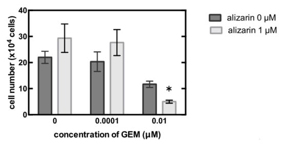 MiaPaCa-2 cells were treated with 0–0.01 µM gemcitabine (GEM) and 0 or 1 µM alizarin for 48 h, and the cell number was counted. Data represent mean ± SEM. n = 3. * p < 0.05.
