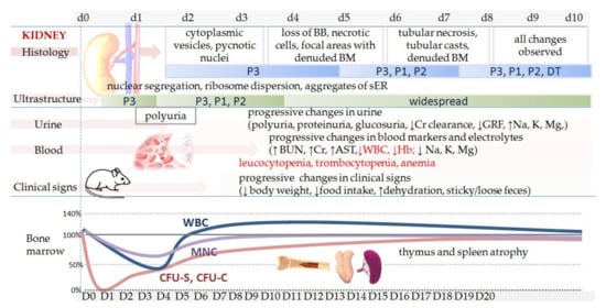 Schematic presentation of clinical signs and kidney function in mice after a nephrotoxic dose of cisplatin. First, two days after a single high dose of cisplatin (10–13 mg/kg; ip), minimal structural changes in the proximal tubules (P3) can be detected (i.e., mitochondria alterations, focal loss of the microvillus brush border, pycnotic nuclei, increased cytoplasmic vesicles) [63,64]. More obvious changes such as loss of the brush border or necrotic cells sloughing into the tubular lumen are usually seen 3–4 days after injection and changes are located in all parts of the proximal tubules (P1–3)[63,64,65]. Depending on the dose, increased BUN/Cr are usually observed 3–7 days after cisplatin injection [66,67,68,69], and if nephrotoxicity is reversible, BUN/Cr return to the baseline levels within 14 days [70]. In such cases, the first signs of structural regeneration can be observed 7 days after cisplatin injection [64,71]. A single high dose of cisplatin (B6D2F1: 8 mg/kg, 10 mg/kg, 12 mg/kg, 14 mg/kg; ip) induces dose-dependent weight loss (11–26%), reticulocytopenia with the lowest levels of body weight and reticulocytes observed 6 days after cisplatin injection. Necrosis in kidney tubular cells can be seen up to 10–22 days post-treatment [72]. When a lethal dose is used, death may occur within 10 days [73] and the time course of AKI development or mortality can occur slightly faster, but still 1–2 days after cisplatin injection. Cisplatin (F1 CBAxC57BL, 12 mg/kg, ip) induces lymphocytopenia, thrombocytopenia and anemia. Cisplatin exhibits cytotoxicity to spleen (CFU-S), granulocyte–macrophage (CFU-C) colony-forming units and mononuclear cells (MNC) in bone marrow and white blood cells (WBC) (adapted and modified from Nowrousian et al. [74]) Legend: P1–3 denotes kidney proximal tubules parts 1–3, DT—distal tubules; BB—brush border; BM—basal membrane; BUN- blood urea nitrogen; Cr—serum creatinine; AST—aspartate aminotransferase; WBC—white blood cells; Hb—hemoglobin; GFR—glomerular filtration rate; CFU—colony-forming unit; MNC—mononuclear cells; ER—endoplasmic reticulum.