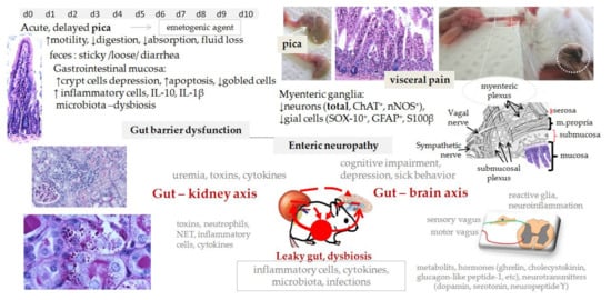 Cisplatin causes acute and chronic effects in the gastrointestinal tract. A single injection of cisplatin causes pica, a rodent-specific behavior of nausea, which reflects as a progressive reduction in food intake, increase in non-nutritive material intake (for instance bedding) and decreased gastric motility [107]. As a result the stomach is full of bedding and markedly enlarged/distended (white arrow) [114]. Reduction in food (68%) and water intake (45%) and an increase in stomach content (threefold) is evident from day 2 on (C57BL/6; 6 mg/kg ip) [114]. First morphological changes in the small intestinal mucosa (i.e., apoptosis, necrosis, decreased number of goblet cells, shortened villi and inflammatory cell infiltration) can be seen 1 day after a single cisplatin injection (B6D2F1: 8 mg/kg, 10 mg/kg, 12 mg/kg, 14 mg/kg; ip; d1,3,6,10,14) followed by reduced mucosal digestive function (depletion in maltase, sucrose, disaccharidase activity and reduced absorption) [108,115]. Depression in crypt cell production is already evident 2h after cisplatin and is maximal between 12 and 24 h post-treatment (CBA: 10 mg/kg, ip). Cisplatin causes lesions also in the colon mucosa, however, they appear later and are less severe [72]. The severity of gastrointestinal damage and mucosal dysfunction is dose-dependent and can persist up to 10 days after a single sub-lethal dose of cisplatin (B6D2F1: 8 mg/kg, 10 mg/kg, 12 mg/kg, 14 mg/kg; ip; d1,3,6,10,14) [72]. Mucosal recovery is slow, first signs of recovery can be observed 7 days post-treatment [72]. Repeated cisplatin administration (C57BL/6; 4 mg/kg/week for 4 weeks, ip; ↓20% BW) besides gut lesions (↑IL-1β and IL-10) also causes delayed pica, [55] and alterations in the ENS seen as loss of neurons in the myenteric ganglia of mouse gastric fundus (total and nNOS+) [56] and colon (neurons (total, ChAT+, nNOS+) and gial cells (SOX-10+, GFAP+, S100β+) [55]. Circulation and the nervous system are the main pathways for communication between the gut, the kidney and the brain in health or disease (the brain–gut–kidney axis). Legend: BW—body weight; ChAT—choline acetyltransferase; ENS—enteric nerve system; GFAP—glial fibrillary acidic protein; NET—neutrophil extracellular traps; nNOS—neuronal nitric oxide synthase; ip—intraperitonealy.