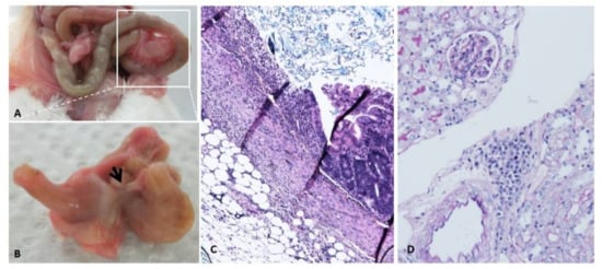 Cisplatin can have long-term effects in the gastrointestinal tract (A). A case of penetrating ulcer (B, arrow and C) in a mouse that survived a single lethal dose of cisplatin (17 mg/kg). Three months after cisplatin recovery, body weight started to decrease, and the mouse was killed and autopsy performed. Inflammatory cells found in the kidney (D).