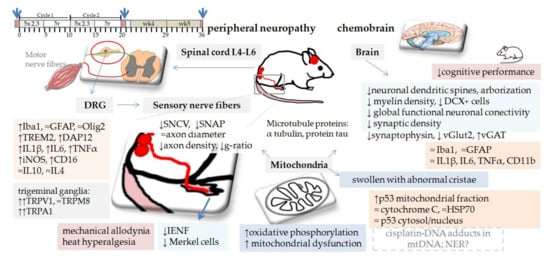Cisplatin neurotoxicity. In mice, two cycles of cisplatin (2.3 mg/kg/daily for 5 days followed by 5 days recovery; 5d+5r/5d+5r; cumulative dose 23 mg/kg) resulted in reduced density of intraepidermal nerve fibers (IENF) (wk3, and wk5) [152,164] and epidermal Merkel cells [152] in the mouse plantar footpad. Merkel cells, mechanosensory cells actively involved in touch reception (tactile sensation), [165,166,167] are proposed to underlie sensory dysfunction in diabetic patients and animals [168]. In sensory nerves (sciatic, caudal, tibial) mild hypomyelination with few degenerating axons (reduced density of myelinated fibers without alterations in axon diameter) can be observed together with a slight decrease in the sensory nerve conduction velocity (SNCV; indication of demyelination) and the sensory nerve action potential (SNAP) [153]. In sensory neurons (trigeminal ganglia) cisplatin activated the transient receptor potential (TRP) channels (TRPA1, TRPV1) [151], a non-selective cation channels involved in chemical and thermal evoked pain sensation [169]. In the spinal cord (L4-L6) cisplatin activated microglia (Iba1), induced pro-inflammatory cytokines (IL-1β, IL-6, TNFα, iNOS, CD16, a marker of pro-inflammatory microglia (wk3) and increased protein levels of triggering receptor expressed on myeloid cells 2 (TREM2) and DNAX activating protein of 12 kDa (DAP12) (wk3) [152]. TREM2/DNAX is a receptor complex predominantly expressed on microglia in the central nervous system associated with neurodegenerative diseases and inflammatory response of microglia [152]. Cisplatin induced structural abnormalities in cerebral white matter (loss of neuronal dendritic spines and arborizations) [145,146] and reduced myelin density in the cingulated cortex [147]. It also [145] decreased cerebral neurogenesis (DCX+ cells) [146] but did not cause inflammation (IL1β, IL6, TNFα, GFAP, CD11b) [146] or microglia (Iba1−, GFAP−) activation [145]. However, decreased synaptic integrity (synaptophysin, vGlut2, vGAT) in the prefrontal cortex [148] and global functional neuronal connectivity in the mouse brain was found (fMRI) [147]. Cisplatin induced mitochondrial dysfunction and structural abnormalities in brain synaptosomes [147]. Mice treated with three cycles of cisplatin (protocol 2.3 mg/kg 5d + 5r/5d + 5r/5d + 5r; cumulative dose 34.5mg/kg) developed more severe impairment of mitochondrial transport and mitochondrial dysfunction in the hippocampus [149] (43% decrease in cytochrome C activity, ATP production, 96% increase in ROS, 29% decrease in mitochondrial membrane potential, impaired mitochondrial transport, reduced α-tubulin acetylation in the hippocampus, decrease in dendritic spine and synaptic density (vGlut1 and PSD95) [149]. Legend: DAP12—DNAX activating protein of 12 kDa; DRG—dorsal root ganglia; GFAP—glial fibrillary acidic protein; IENF—intraepidermal nerve fibers; IL—interleukine; Iba1—ionized calcium-binding adaptor molecule 1; iNOS—inducible nitric oxide synthase; L4-L6—lumbal vertebra; mtDNA—mitochondrial DNA; NER - nucleotide excision repair; Olig-2—oligodendrocyte lineage gene 2; ROS—reactive oxidative species; SNAP—sensory nerve action potential; SNCV—sensory nerve conduction velocity; TNFα—tumor necrosis factor alpha; TRP—transient receptor potential channels (TRPA1, TRPV1); TREM2—triggering receptor expressed on myeloid cells 2; vGlut2—vesicular glutamate transporter 2; vGAT—vesicular GABA transporter.