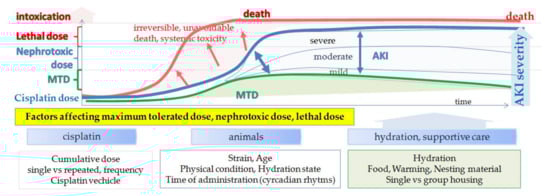 It is interesting that in the 1980s the effects of hydration and cisplatin vehicle (Table 5) on nephrotoxicity and tumor burden were tested in cisplatin treated mice and rats. Although both hydration [183] and the vehicle in which cisplatin was dissolved [184,185] markedly reduced mortality and nephrotoxicity, hydration became a routinely used method of nephrotoxicity prevention only in clinics but not in preclinical models. Intravenous hydration using isotonic saline solution significantly reduces cisplatin half-life, urinary cisplatin concentrations and proximal tubule transit time [3,12], which reduces nephrotoxicity and allows higher doses of cisplatin for the cancer treatment. Thus, hydration affects the MTD dose and, consequently, also the therapeutic effect of cisplatin (dose dependent) in preclinical studies (see Section 3.3). In addition, not only the incidence but also the severity of cisplatin toxicity is dose dependent. Based on the cisplatin protocol mice thus can develop (Figure 6): changes in molecular mechanisms without structural damage (process is in the range of the physiological limits and does not affect the clinical picture, although molecular markers can show significant increases; MTD); changes in molecular mechanisms with structural damage (although structural damage is histologically confirmed and clinical signs are present, damage is still in the range where regression and restitution or repair is possible; mild, moderate); clinical signs are present and structural damage is obvious, regression and repair is possible only if properly treated (severe-systemic inflammation) and intoxication (irreversible).