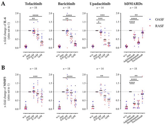 Effects of tofacitinib, baricitinib, upadacitinib and biologic disease modifying anti-rheumatic drugs (bDMARDs) on interleukin (IL)-6 (A) and matrix metalloproteinase (MMP)3 (B) secretion in SF-Th cell co-cultures. Synovial fibroblasts (SF) from rheumatoid arthritis (RA) patients (RASF in red) or from OA patients (OASF in blue) were co-cultured with Th cells (ratio 1:5) in the presence or absence of anti-CD3/ anti-CD28 antibodies and treated with therapeutics as indicated. The concentration of IL-6 and MMP3 within co-culture supernatants harvested on day 6 was determined by enzyme-linked immunosorbent assay (ELISA). Results are presented as x-fold change with stimulated SF-Th cells set to 1 (mean concentrations ± SEM in co-cultures of SF with stimulated Th cells: IL-6: 600.02 ± 81.47 ng/mL; MMP3: 84.79 ± 22.48 ng/mL). BDMARDs were used at a concentration of 100 μg/mL. Data shown as grand mean, significance tested using Wilcoxon signed-rank test, p **** ≤ 0.0001, p *** ≤ 0.001, p ** ≤ 0.01, p * ≤ 0.05.