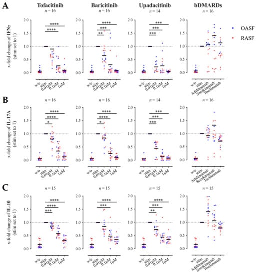 Effects of tofacitinib, baricitinib, upadacitinib and bDMARDs on interferon (IFN)γ (A), IL-17A (B) and IL-10 (C) secretion in Th cell-SF co-cultures. RASF (red) or OASF (blue) were co-cultured with Th cells (ratio 1:5) in the presence or absence of anti-CD3/ anti-CD28 antibodies and drugs as indicated. Results are presented as x-fold change with stimulated SF-Th cells set to 1 (mean concentrations ± SEM in co-cultures of SF with stimulated Th cells (in pg/mL): IFNγ: 452.06 ± 137.67; IL-17A: 6772.01 ± 1689.89; IL-10: 2140.26 ± 185.16). Supernatants were collected on day 6 and cytokine concentrations were quantified by ELISA. Data shown as grand mean, significance tested using Wilcoxon signed-rank test, p **** ≤ 0.0001, p *** ≤ 0.001, p ** ≤ 0.01, p * ≤ 0.05.