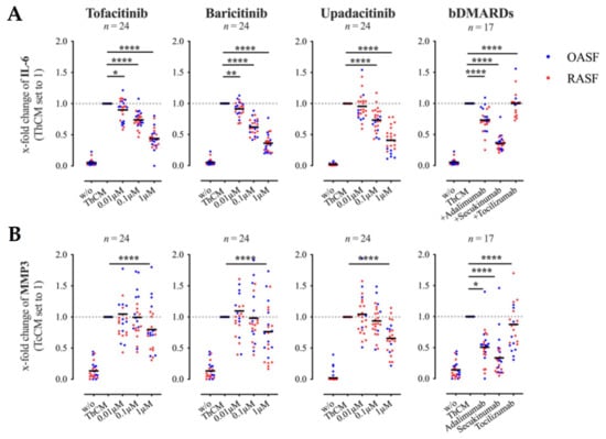 Effects of tofacitinib, baricitinib, upadacitinib and bDMARDs on IL-6 (A) and MMP3 (B) expression by SF stimulated with conditioned culture medium of Th cells (ThCM). Th cells were stimulated with anti-CD3/anti-CD28 antibodies and supernatants (ThCM) were collected on day 4. RASF (red) or OASF (blue) were cultured with or without ThCM and treated, respectively. Supernatants were collected on day 5 and analyzed by ELISA. Results are presented as x-fold change with SF stimulated with ThCM set to 1 (mean concentrations ± SEM in ng/mL: IL-6: 244.64 ± 20.62; MMP3: 42.64 ± 8.97). Data shown as grand mean, significance tested using Wilcoxon signed-rank test, p **** ≤ 0.0001, p ** ≤ 0.01, p * ≤ 0.05.