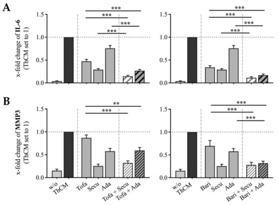 Next, we tested whether a combination of JAKi and bDMARDs would have a greater effect on IL-6 or MMP3 expression by ThCM-stimulated SF as compared to the individual inhibitory effects. Therefore, SF were stimulated with ThCM in the absence or presence of tofacitinib, baricitinib, adalimumab or secukinumab alone or with a combination of a JAKi with either of the bDMARDs. Treatment with tofacitinib or baricitinib in combination with either adalimumab or secukinumab, significantly reduced the secretion of IL-6 by SF as compared to SF treated with one individual JAKi or bDMARD (Figure 4A). However, MMP3 secretion mediated by secukinumab was not further decreased by simultaneous treatment with JAKi (Figure 4B). Only a combined treatment with baricitinib and adalimumab resulted in a significantly stronger inhibition of MMP3 production by SF compared to the individual inhibitory effects (Figure 4B).