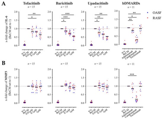 Effects of tofacitinib, baricitinib, upadacitinib and bDMARDs on IL-6 (A) and MMP3 (B) secretion by SF stimulated with B cell-conditioned culture media (BcCM). B cells were stimulated with staphylococcus aureus Cowan I (SAC) plus IL-2 and supernatant (BcCM) was collected on day 3. OASF (blue) and RASF (red) were cultured with or without BcCM and drugs as indicated for 5 days. Supernatant was collected and cytokines quantified by ELISA. Results are presented as x-fold change with SF stimulated with BcCM set to 1 (mean concentrations ± SEM in ng/mL: IL-6: 215.21 ± 42.02; MMP3: 244.95 ± 49.37). bDMARDs shown were used at a concentration of 100 μg/mL. Data shown as grand mean, significance tested using Wilcoxon signed-rank test, p *** ≤ 0.001, p ** ≤ 0.01, p * ≤ 0.05.