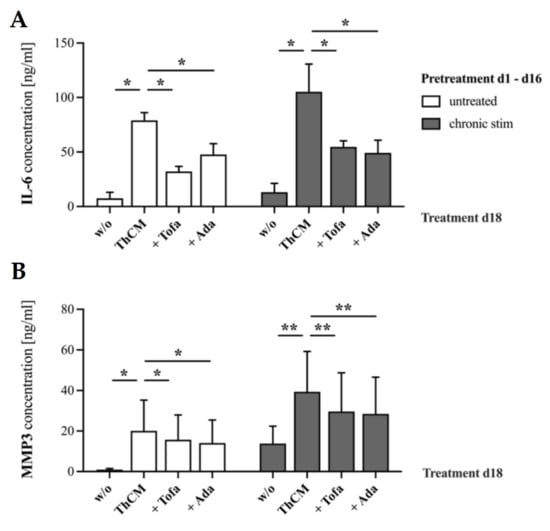 Stimulation on day 18 by ThCM significantly increased the secretion of IL-6 and MMP3 by primary stimulated SF as well as chronically stimulated SF (Figure 6). Treatment with either tofacitinib or adalimumab significantly reduced the secretion of IL-6 and MMP3 by primary stimulated SF, confirming the previous results (Figure 3). Importantly, the inhibition of JAKs by tofacitinib significantly suppressed IL-6 (Figure 6A) and MMP3 (Figure 6B) production even in chronically stimulated SF. Similarly, treatment with adalimumab efficiently reduced the secretion of IL-6 and MMP3 by SF which had previously been chronically stimulated with ThCM (Figure 6A,B).