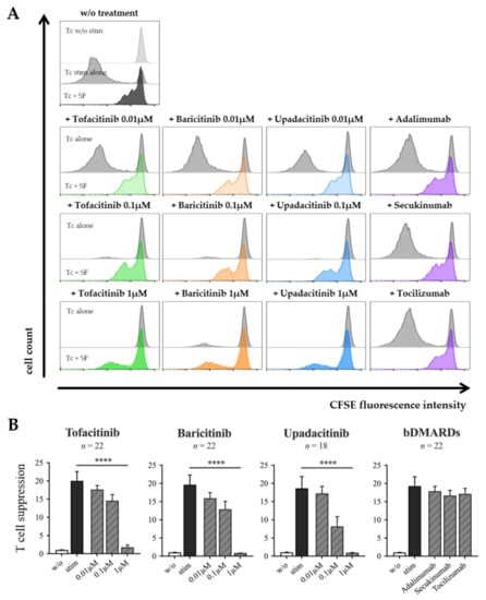 In co-cultures, Th cell proliferation was strongly suppressed by SF, confirming previous results (Figure 7A,B). Treatment of co-cultures with JAKi dose-dependently attenuated the capacity of SF to suppress the proliferation of Th cells. At a concentration of 1μM, all of the JAKi tested significantly reduced the suppressive capacities of SF (Figure 7B). In contrast, the addition of the bDMARDs adalimumab, secukinumab or tocilizumab to co-cultures of Th cells and SF had no effect on the SF-mediated suppression of Th cell proliferation (Figure 7A,B).