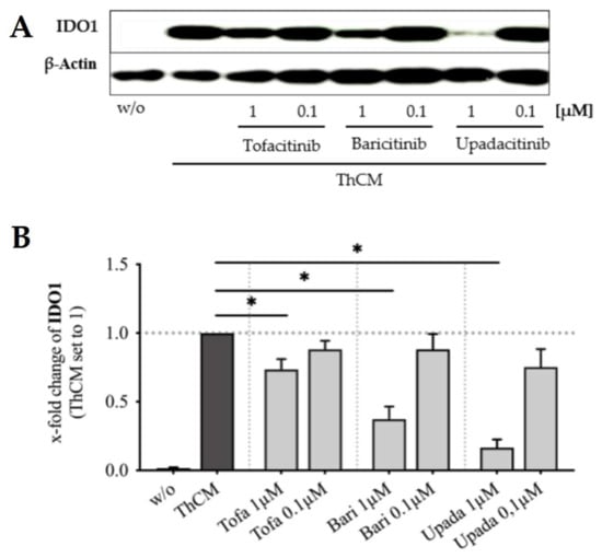 Effects of tofacitinib, baricitinib and upadacitinib on the expression of IDO1 by SF stimulated with ThCM. OASF or RASF were left untreated (w/o) or stimulated with ThCM and treated with tofacitinib (n = 7), baricitinib (n = 7) or upadacitinib (n = 5). On day 4, SF were harvested and whole cell extracts were subjected to immunoblot analysis. Shown are the results from one representative experiment (A) and the x-fold change of indoleamine 2,3-dioxygenase 1 (IDO1) relative to b-actin expression with SF stimulated with ThCM set as 1 detected in all experiments (B). Data shown as mean ± SEM, significance tested using Wilcoxon signed-rank test, p * ≤ 0.05.