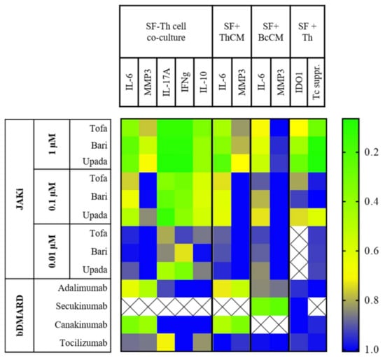 Schematic summary of the effects of JAKi and bDMARDs on the SF or Th cell phenotype. The figure summarizes the results of this study by presenting the results as a heatmap. A value of 1.0 (blue) means no suppressive effect of JAKi or bDMARDs, a value of 0.0 (green) a 100% reduction in the corresponding cell function compared to untreated cells.