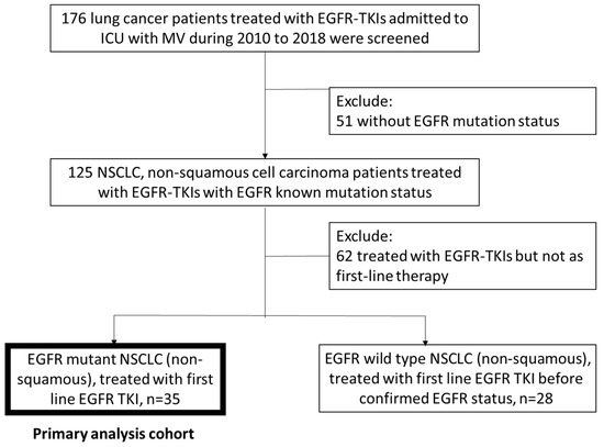 - Hsia, T.C.; Tu, C.Y.; Chen, H.J. The impact of rescue or maintenance therapy with EGFR TKIs for Stage IIIb-IV non-squamous non-small-cell lung cancer patients requiring mechanical ventilation. BMC Anesth. 2014, 14, 55. [Google Scholar] [CrossRef]