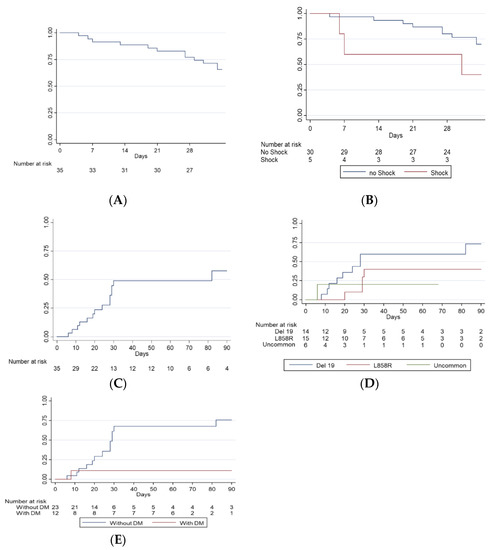 Survival and rate of successful weaning from mechanical ventilation of lung cancer patients receiving EGFR-TKIs in the ICU. (A) 28-day ICU survival. (B) Kaplan–Meier plot of survival in group with shock or not. (C) Cumulative incidence of patients with successful weaning from mechanical ventilators. (D) Cumulative incidence of successful weaning in patients with different EGFR mutation. (E) Cumulative incidence of successful weaning in patients with or without DM. Acronyms: EGFR = epidermal growth factor receptor, ICU = intensive care unit, TKI = tyrosine kinase inhibitor, DM = diabetes mellitus.
