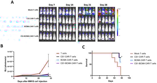 3.5. CS1 and CS1-BCMA-CAR-T Cells Effectively Block Multiple Myeloma Tumor Growth and Prolong Mouse Survival