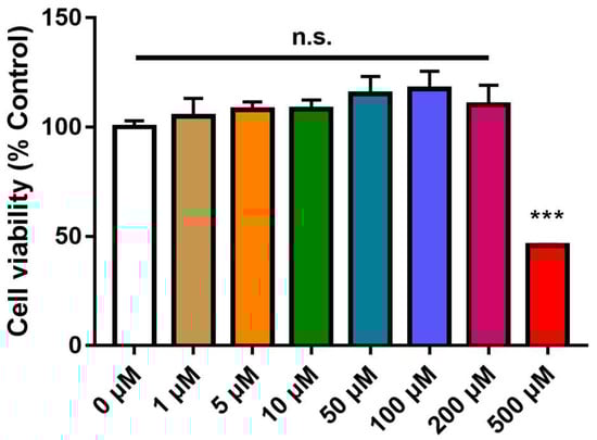 Figure 1 demonstrates the molecular structure of LOBE. To exclude the possibility of a drug cytotoxicity affecting investigation of the anti-inflammatory effect, the cytotoxicity of LOBE was evaluated. LOBE doses ranging from 1 µM to 200 µM did not significantly increase nor decrease cell viability (Figure 2, control: 100% ± 4.09, control vs. LOBE 1 µM: 110.35% ± 9.92, LOBE 5 µM: 108.19% ± 4.36, LOBE 10 µM: 111.35% ± 4.48, LOBE 50 µM: 118.48% ± 7.24, LOBE 100 µM: 123.4% ± 4.73, LOBE 200 µM: 115.36% ± 9.74, not significant: n.s.). However, a significant decline was observed in 500 µM of LOBE (Control vs. LOBE 500 µM: 100% ± 4.09 vs. 46.86% ± 0.62, *** p < 0.001). Three concentrations 50 µM, 100 µM, and 200 µM of LOBE were selected and used in subsequent experiments.