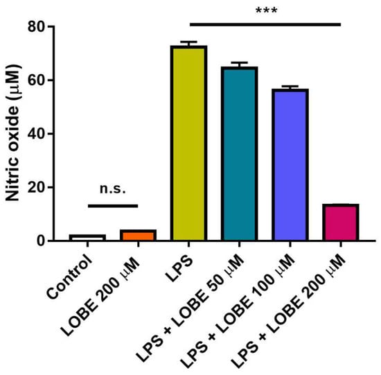 Inhibition of nitric oxide (NO) production by LOBE in lipopolysaccharide (LPS)-stimulated BMDMs. BMDMs were pre-treated with or without LOBE for 20 min, followed by stimulation or not with 0.1 µg/mL of LPS for 24 h. After 24 h, the NO-containing supernatant from each group was collected to quantify NO concentrations. Results are the mean ± SD of triplicate experiments: n.s., *** p < 0.001, significant difference as compared to the control group and each group by a one-way ANOVA followed by Tukey’s post hoc analysis.