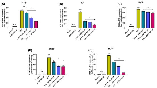 LOBE mediated down-regulation of gene expression of key pro-inflammatory molecules in LPS-induced BMDMs. The BMDMs were pre-treated with or without LOBE for 20 min, and then stimulated or not with 0.1 µg/mL of LPS for 24 h. The cells were then subjected to real-time quantitative polymerase chain reaction (RT-qPCR) analysis to detect mRNA expression levels of proinflammatory mediators (A) interleukin-1β (IL-1β) (B) IL-6, (C) inducible nitric oxide synthase (iNOS), (D) cyclooxygenase-2 (COX-2), and (E) monocyte chemoattractant protein-1 (MCP-1). The mRNA expressions of target genes were normalized to glyceraldehyde 3-phosphate dehydrogenase (GAPDH) mRNA. The expression level of control for all indicated genes was set at 1-fold, and relative fold change was calculated. Results are the mean ± SD of triplicate experiments: n.s., ** p < 0.01, *** p < 0.001, significant difference as compared to the control group and each group by a one-way ANOVA followed by Tukey’s post hoc analysis.