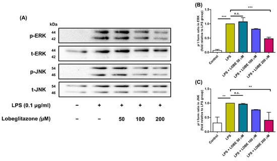 Effect of LOBE on phosphorylation level of extracellular regulatory kinase (ERK) (A,B) and c-Jun N terminal kinase (JNK) (A,C) of mitogen-activated protein kinase (MAPK) signaling pathway in LPS-stimulated BMDMs. BMDMs were pre-treated with or without LOBE for 20 min prior to 0.1 µg/mL of LPS treatment. After LPS stimulation, cells were harvested for Western blot analysis to detect changes in phosphorylation in ERK and JNK signaling. The ratio of band intensity of phosphorylated form over total form was quantified. The p/t volume for LPS group was set to 1-fold, and fold changes were calculated relative to LPS group. Results are the mean ± SD of triplicate experiments: n.s., ** p < 0.01, *** p < 0.001, significant difference as compared to the control group and each group by one-way ANOVA followed by Tukey’s post hoc analysis.