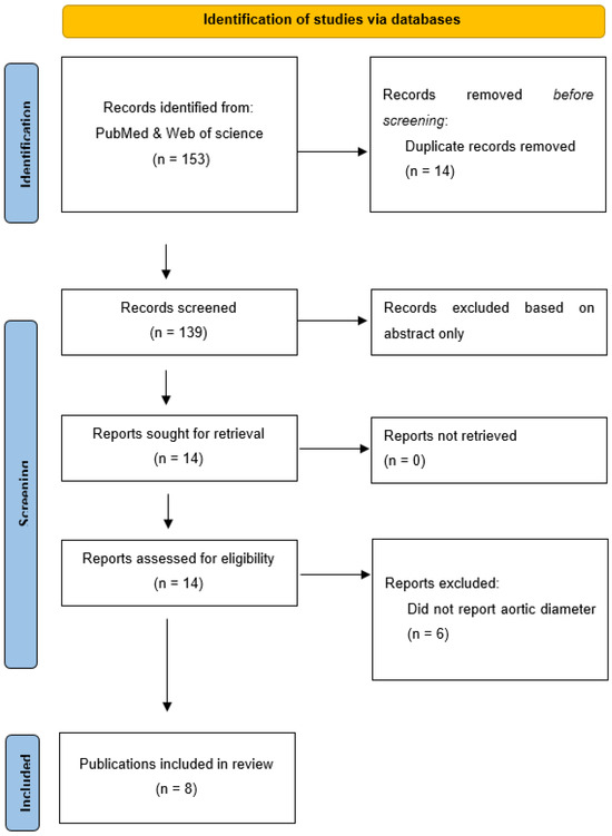 Preferred Reporting Items for Systematic Reviews and Meta-Analyses flow diagram. A total of 153 publications were screened and, after exclusion of irrelevant studies, 8 publications were included.