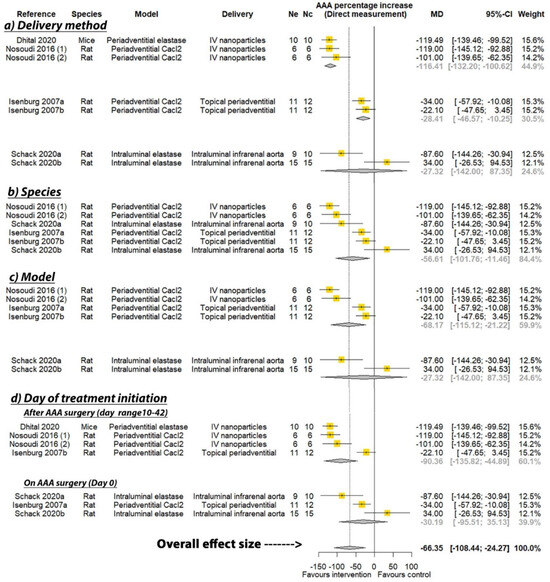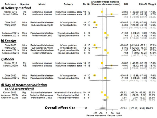 PGG was reported to significantly reduce the percentage increase in aortic diameter in six of the seven studies where this was measured by direct observation, and three of the six studies that measured aortic diameter percentage increase by ultrasound (see Table 2). A meta-analysis suggested that PGG significantly reduced aortic expansion when measured by direct observation (MD: −66.35%; 95% CI: −108.44, −24.27; p = 0.002), but not ultrasound (MD: −32.91%; 95% CI: −75.16, 9.33; p = 0.127), compared to the controls (Figure 2 and Figure 3). In studies measuring aortic expansion by direct observation, PGG administered intravenously through nanoparticles (MD: −116.41%; 95% CI: −132.20, −100.62; p < 0.001), topically to the adventitia of the aorta (MD: −28.41%; 95% CI: −46.57, −10.25; p = 0.002), studied in rats (MD: −56.61%; 95% CI: −101.76, −11.46; p = 0.014), in the calcium chloride model (MD: −68.17%; 95% CI: −115.12, −21.22; p = 0.004), and where PGG treatment was initiated after model development on days ranging between 10 and 42 (MD: −90.36; 95% CI: −135.82, −44.89; p < 0.001), significantly reduced aortic expansion (Figure 2). A sensitivity analysis of the studies reporting aortic expansion by direct measurement found that the individual removal of any single study did not change the significance of the findings (Supplementary Table S1). In studies measuring aortic expansion by ultrasound measurement, PGG administered intravenously using nanoparticles significantly reduced aortic expansion (MD: −98.40%; 95% CI: −113.99, −82.81; p < 0.001) (Figure 3). The findings of other sub analyses were not significant (Figure 3). Funnel plots were not performed, due to data not being available from a minimum number of 10 studies.