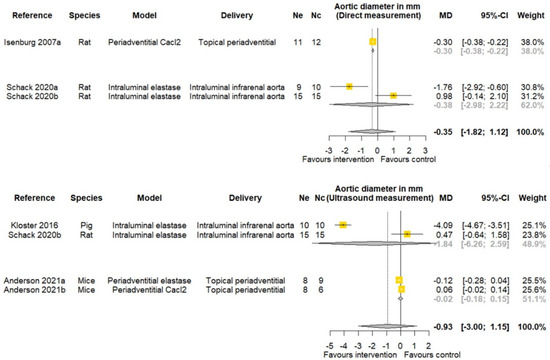 Meta-analysis of studies testing the effect of pentagalloyl glucose on aortic expansion measured by ultrasound. MD = Mean difference; Ne = Number of animals in experimental group; Nc = Number of animals in control group; CI = Confidence interval. a/b: Three of the publications included two separate studies that were considered independently.
