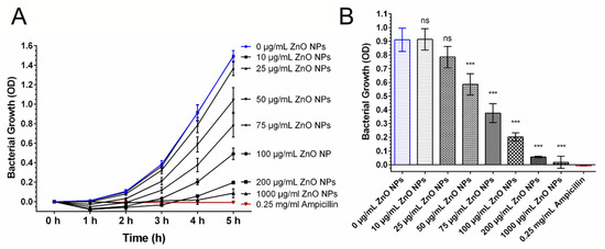 Antibacterial Activity of ZnO NPs. Bacterial growth was monitored by measuring the OD at 600 nm. Bacterial growth was decreased in the presence of ZnO NP (A). Within 4 h, concentrations of 50 µg/mL ZnO NPs or higher were able to reduce bacterial growth significantly (p < 0.001) compared with untreated bacterial control cultures (B). Treatment of bacteria with 10 µg/mL and 25 µg/mL ZnO NPs led to no significant reduction in bacterial growth (p > 0.05). Bacteria treated with 0.25 mg/mL Ampicillin served as positive control for antibacterial activity. Shown are mean values ± SD. One-way ANOVA, comparison of each dosage group with untreated control group, correction for multiple comparisons by Bonferroni, N ≥ 3, *** p < 0.001, ns = not significant.