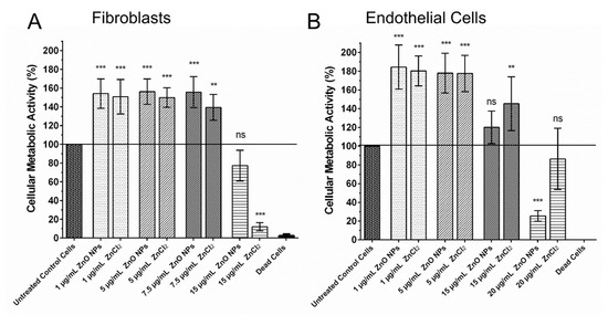 Zinc in the Form of ZnO NPs and ZnCl2 can Stimulate Fibroblasts and Endothelial Cells. Treatment of fibroblasts with 1–7.5 µg/mL ZnO NPs or equivalent amounts of free zinc ions in the form of ZnCl2 were able to significantly increase their metabolic activity (A). Similarly, endothelial cells were significantly stimulated by concentrations of 1–15 µg/mL ZnO NPs or equivalent amounts of free zinc ions in the form of ZnCl2 (B). Shown are mean values ± SD. One-way ANOVA, comparison of each dosage group with untreated control group, correction for multiple comparisons by Bonferroni, N ≥ 3, *** p < 0.001, ** p < 0.01, ns = not significant.