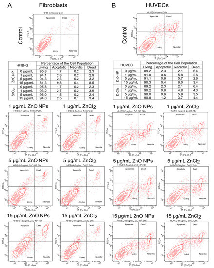 Relative Proportions between Living, Apoptotic, Necrotic, and Dead Cells after Treatment with 1, 5, or 15 µg/mL ZnO NPs or Equivalent Amounts of ZnCl2 in Fibroblasts (A) and Endothelial Cell Populations (B). Whether cell death occurred following treatment with ZnO NPs or ZnCl2 was explored by detection of apoptotic, necrotic, and dead cells in the cell population via staining with propidium iodide (PI) and annexinV-FITC and subsequent flow cytometric analysis. In (A), the results from the fibroblast populations are shown, while in (B), those from the endothelial cell populations are shown. The contour blot at the top of each column shows the proportions between living, apoptotic, necrotic, and dead cells in the untreated control population. In the lower left quadrant, living cells are located; in the upper left quadrant apoptotic cells can be seen; in the upper right quadrant are dead cells; and in the lower right quadrant are necrotic cells. Underneath in the table, the raw values of the exemplary measurement are shown (N = 1). Below, the two-by-three figures show each treatment group in a contour blot individually, with the fibroblasts on the left-hand side and the endothelial cells on the right-hand side. Treatment with 1 or 5 µg/mL ZnO NPs or equivalent amounts of ZnCl2 did not lead to an increase in the proportion of apoptotic, necrotic, or dead cells in the cell populations, neither in fibroblasts nor in endothelial cells. In the range of concentrations studied here, only the treatment of fibroblasts with 15 µg/mL ZnO NPs led to an increase in the percentage of apoptotic and dead cells in the cell population.