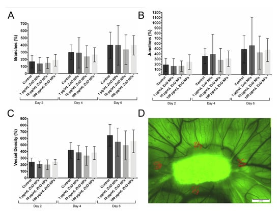 To quantify the development of the vascular system next to the gelatin sponge on which the ZnO NPs were applied, four regions of interest (ROIs) were placed next to the sponge. These ROIs were monitored over time, and the vessels were counted in these regions (red marks in Figure 5D). The number of branches, junctions, and the vessel density were calculated and expressed in reference to the numbers of each individual egg on day 0 in percentage values (Figure 5). This ensured tracking of the development of each individual egg. It facilitated the comparison between different eggs and the normalization of the different starting conditions due to slightly different development speeds of the chicken embryos. In Figure 5 there is shown the development of the vascular system of the CAM following treatment with 1 µg/mL, 10 µg/mL, or 100 µg/mL ZnO NPs in comparison to control eggs expressed as the relative number of branches (Figure 5A), junctions (Figure 5B), and the vessel density (Figure 5C) on day 2, day 4, and day 6 after treatment. It can be seen that branches, junctions, and vessel density increased over time in all treatment groups. Furthermore, it is noticeable that the interindividual differences between the chicken embryos are quite pronounced in all treatment groups. Possibly 10 µg/mL ZnO NPs had slightly negative effects on the number of branches, junctions, and the vessel density on day 4 and day 6 after the beginning of treatment. However, no significant differences between the treatment groups were found.