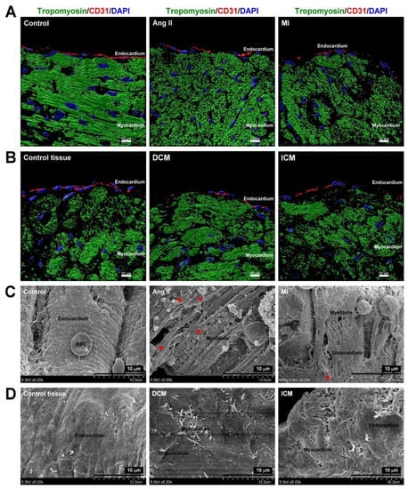 Irrespective of whether it is hypertensive or ischemic HF, EE dysfunction initiates the progression of HF [28]. We established animal models of HF induced by Ang II (hypertensive HF) and MI (ischemic HF) treatment. We also collected non-HF atrial specimens and specimens of HF caused by DCM and ICM for further examination. SEM data demonstrated that the endocardium in the control group was intact and that there was no damage or cracking. In contrast, the endocardium in the MI and Ang II groups showed severe myofibril damage and fracture with a lower number of mitochondria filled between the broken myofibrils. In addition, the HF group also had an unidentified composite deposited on the damaged endocardium (Figure 1A). In the human specimen, we found that the DCM and ICM groups had apparent endocardial damage and were accompanied by the deposition of unknown composites on the EE (Figure 1B). Next, immunostaining was used to confirm whether the integrity of the endocardial structure was damaged during HF. The expression of CD31 (EE marker protein) was significantly reduced in the animal and human HF groups (Figure 1C,D) indicating EE dysfunction, which causes myofibril fragmentation, mitochondrial dysfunction, and unidentified composite deposition.