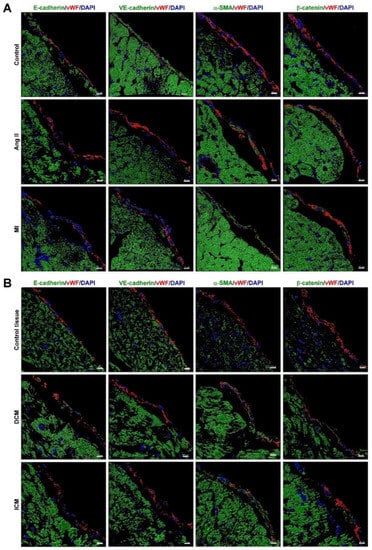 EndMT is a pathological process in which fibroblast-like cells replace the original endothelial cells. It is common after endocardial ischemia or damage due to the disease. This process is also essential for the progression of HF [11]. Figure 2 shows the HF-induced EndMT in the endocardium. Immunofluorescence labeling of the control group showed a higher expression of endothelial-specific marker von Willebrand Factor (vWF) combined with the endothelial marker E-cadherin and VE-cadherin in the endocardium; however, the mesenchymal markers α-SMA and β-catenin were not upregulated. In the HF groups, mesenchymal markers α-SMA and β-catenin were highly expressed in combination with vWF, significantly reducing the expression of endothelial markers E-cadherin and VE-cadherin. These data show that HF induced EndMT in human and mouse endocardial endothelial cells.
