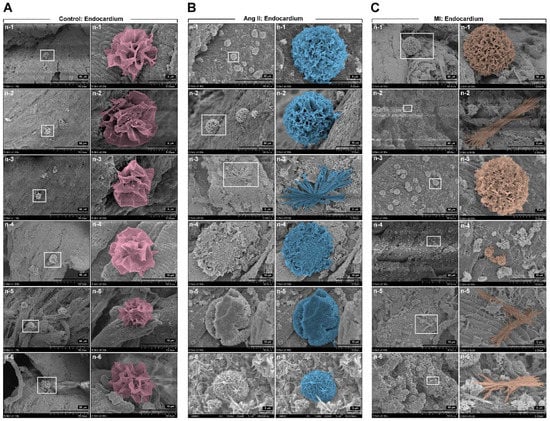 Research on the deposition of unknown substances in the endocardium in HF diseases is limited. Figure 3 shows the deposition of unknown substances in the endocardium. The HF samples showed the deposition of multiform unknown composites, including flower-like structures (in the NR group) (Figure 2A). In the HF group, the appearance of multiform unknown composites included sponge-like, hedgehog-like, mushroom-like, grass-like, brushwood-like, ball containing stingers such as asparagus-like, underbrush-like, scarecrow-like, moss-like, star-like, and hydrangea-like structures (Figure 2B,C). These data showed that the endocardial surface covering may have unknown composite accumulation of different shapes, especially in HF compared with the control, and that the composition elements and functions may vary.