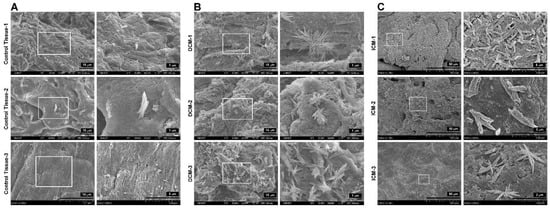 Figure 5 shows the accumulation of unknown substances in the human HF endocardium observed by SEM. A small number of deposits that looked like stalactites or stalagmites were found in the endocardium of the right atrial appendage without HF (in control tissue groups 1–3) (Figure 5A). In the DCM HF group, a significant accumulation in the endocardium was found, and it resembled bushes or crystal clusters (Figure 5B). In the ICM HF group, many accumulations of lichen or crystal clusters were found in the endocardium (Figure 5C). The results of this study and the pattern of deposits in the animal HF model confirm that the endocardium in humans without HF may have a small number of stalactite-like deposits, whereas the composites on the endocardium in the HF group might appear as bushes or lichens.