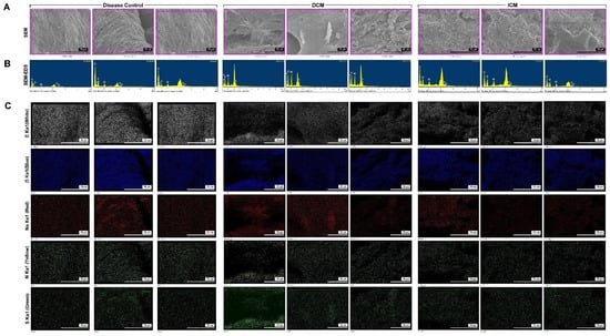 SEM/ED mapping of the mineral deposition in healthy subjects and patients with DCM and ICM. (A) SEM image of mineral deposition in HF patients. (B) SEM-EDS mapping. (C) SEM-EDS elemental analysis.