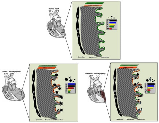 Elemental analysis shown many deposits of different shapes rich in Na on the endocardium of HF. In the animal model of HF, compared with the other two groups, the MI group presented significantly reduced C concentration, whereas the percentage of O and Na was significantly increased. It is worth mentioning that the MI group was the only group with deposits containing N, whereas the concentration of S did not differ among the three groups. Our findings showed a correlation between the increase in Na and N concentrations in the ischemic HF group. In the Ang II group, the C and S concentrations in the composites marginally decreased compared with those in the control group except for an increase in the Na and O concentrations. In human HF heart sections, the composites of the ICM group showed a reduction in O concentration and an increase in C, S and Na concentrations. This trend was not like that observed in the MI group in the animal experiments. However, the concentration of N was not different in the composites among the three tissues. In the DCM group composites, the percentage of O decreased, whereas that of C, Na, and S increased. Our finding showed a correlation between the increase in Na and S concentrations in the DCM group.