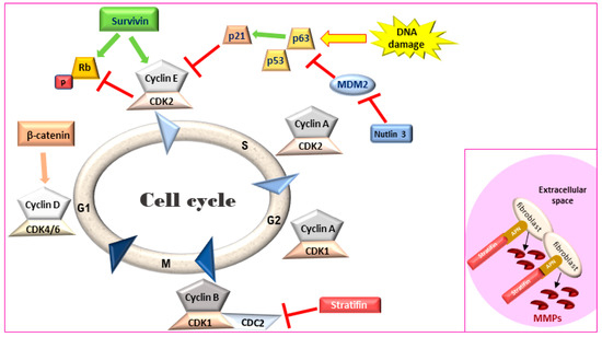 Cell cycle regulation. Survivin leads to an accelerated S phase and phosphorylates Rb thereby blocking its action. Stratifin blocks CDK1-Cyclin B complex causing G2/M arrest. Inset: In the extracellular space, stratifin can bind to aminopeptidase N (APN) on the plasma membrane of stromal fibroblasts and lead to the production of matrix metalloproteinases (MMPs). Rb: retinoblastoma, MDM2: mouse double minute 2 homology, CDK: cyclin-dependent kinase.