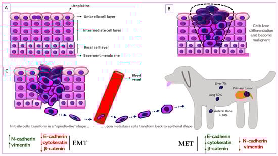 Schematic representation of Epithelial-to-Mesenchymal Transition (EMT) in canine MIUC. (A). Structure of normal urothelium. (B). Urothelial tumor outlined with the black dashed line. (C). EMT process in which the immotile urothelial cells upregulate mesenchymal (N-cadherin, vimentin) and downregulate epithelial (e-cadherin, cytokeratin) markers, acquire a “spindle-like” shape, become motile and infiltrate surrounding tissues and blood vessels. When they reach the metastatic site, the process is reversed (Mesenchymal-to-Epithelial Transition, MET) accompanied by the upregulation of mesenchymal and downregulation of epithelial markers. Some of the most common metastatic sites are depicted.