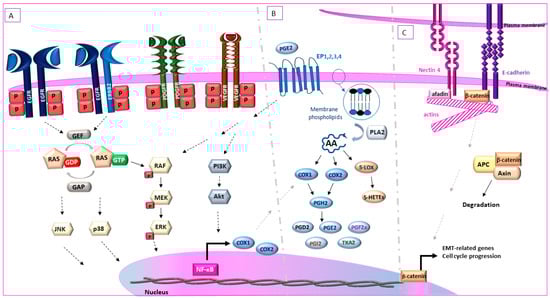 The tyrosine kinase receptor family consists of the fibroblast growth factor receptor (FGFR), platelet-derived growth factor receptor (PDGFR), vascular endothelial growth factor receptor (VEGFR), the stem cell factor receptor (KIT), and most prevalently the EGFR (epidermal growth factor receptor) family of receptors (EGFR/HΕR1, ErbB2/HER2, ErbB3/HER3, ErbB4/HER4) [79]. These receptors consist of an extracellular, a transmembrane and an intracellular domain and, upon activation, they form homo- or heterodimers that interact with intracellular mediators, activating signaling pathways such as MAPK/ERK, PI3K/Akt and COX2 regulating cell proliferation, survival and metastasis (Figure 3A) [80].