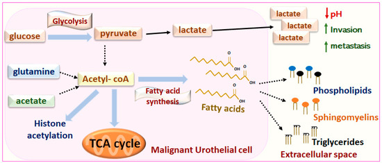Altered metabolic regulation has been considered a hallmark of cancer for the past decade [165]. In 1929 Otto Warburg first noticed that tumor cells converted glucose to lactate through aerobic glycolysis, even if sufficient oxygen levels were present. Lactate is then secreted to the extracellular space, acidifying the tumor microenvironment and favoring tumor invasion and metastasis (Figure 4) [166]. Metabolic competition between tumor cells and tumor infiltrating T lymphocytes can lead to weakened anti- tumor immune responses [167]. In addition, newly developing cancer cells require a vast amount of lipids for membrane construction and energy production as fatty acid oxidation produces more than twice the amount of energy as glucose catabolism. Therefore, tumor cells exhibit increased fatty acid production through acetyl-coA either from glucose, glutamine or acetate catabolism. Fatty acids conjugate with glycerol with or without phosphate to synthesize triglycerides and phospholipids, while conjugation with phosphocholine and sphingosine occurs to synthesize sphingomyelins [168]. Sphingomyelin synthesis, storage and catabolism are regulated by a negative feedback loop [169]. Furthermore, metabolic reprogramming also contributes to the epigenetic regulation of genes through the addition of acetyl or methyl groups [170] that act as “switch on/off” regulators of gene expression.