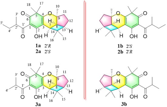 (±)-Hypersine A (1a/1b) and (±)-Hypersine B (2a/2b) were obtained as two pairs of C-2′ epimers. The mixtures of 1a/1b and 2a/2b performed a single chromatographic peak in the conventional RP-18 column, but could be separated into four peaks by chiral columns (Figure S2). The correspondence of the two pairs of enantiomers, 1a/1b and 2a/2b, were ensured by comparing their 1H NMR data (Figure S3). The molecular formulae of 1a/1b and 2a/2b were assigned as C23H32O4, on the basis of the HR-ESI-MS molecular ion peak at m/z 373.2375 [M + H]+ (calculated for C23H33O4+, 373.2379) (1a/1b) and m/z 373.2374 [M + H]+ (calculated for C23H33O4+, 373.2379) (2a/2b), indicating eight indices of hydrogen deficiency. The characteristic absorption bands of UV spectra (203, 226, 251, 276, and 332 nm) and IR spectra (3314 and 1657 cm−1) deduced the presence of an enolic 1,3-diketone moiety in 1 [28,29,30]. The 1H NMR and HSQC spectra of 1 showed the signals assignable to five singlet methyl groups (δH 1.40 (s), 1.36 (s), 1.34 (s), 1.32 (s) and 0.80 (s)), one doublet methyl (δH 1.14 (d, J = 7.2)), and one triplet methyl (δH 0.90 (t, J = 7.2)) The 13C NMR and DEPT-135 afforded twenty-three carbon resonances, including seven methyls, three methylenes, four methines, and nine quaternary carbons. The downfield signals at δC 207.9 (C-1’), 197.3 (C-6), 189.4 (C-2), and 105.0 (C-3) suggested the existence of an enol-β-triketone moiety [22,25,26]. The above data indicated that 1 was similar to (±)-Hyperjaponol A [30], with a filicinic acid core, and proposed to be a derivative of MTPAPs.