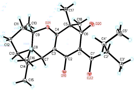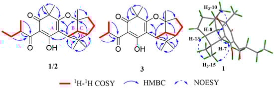 The planning structure of 1 was constructed by analyzing its 2D NMR data (Figure 2). The spin systems of H-7/H-8/H-13/H2-12/H2-11 and H3-2’/H-3’/H2-4’/H3-5’ in the 1H-1H COSY spectrum indicated the existence of two fragments: CH-7–CH-8–CH-13–CH2-12–CH2-11 and CH3-3’–CH-2’–CH-4’–CH3-5’. The HMBC correlations from CH3-17 and CH3-18 to C-4, C-5, and C-6, and from H-7 to C-3, C-4, and C-9 confirmed the presence of the filicinic acid core (ring A), and that the oxygen heterocycles (ring B) were fused to ring A. By referring to (±)-Hyperjaponol A, the 2-methylbutanoyl group was connected to the C-1 of ring A according to the HMBC correlations from H-2’, H-3’, and H-4’ to C-1’. In addition, the HBMC correlations from H-8 to C-11, from H-13 to C-9, and from CH3-10 to C-8, C-9, and C-11 revealed the existence of the five-membered ring C. Furthermore, the HMBC interactions from H-7 to C-14 and from CH3-15 and CH3-16 to C-7, C-13, and C-14 established the infrequent four-membered ring (ring D).